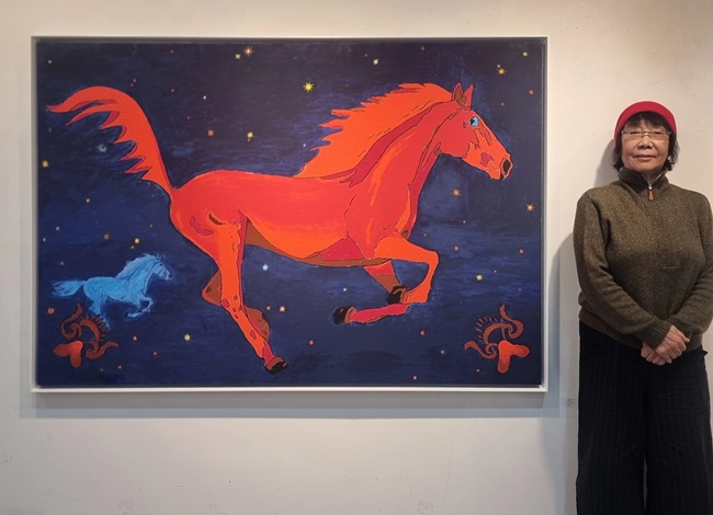 김소선 작가는 2026년 붉은 말의 해를 맞아 우주를 배경으로 힘차게 달리는 븕은 말의 기상을 화폭에 담아냈다. [사진=임요희 기자]