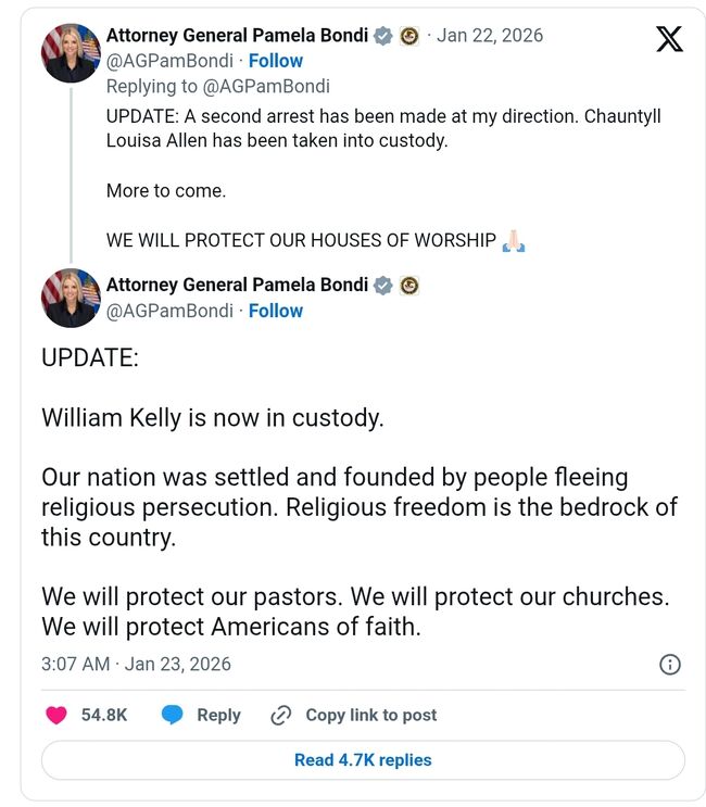 팸 본디 연방 법무장관은 22일(목) 이민 단속에 반대하는 시위를 벌이면서 교회 예배를 방해한 세 명을 체포했다고 밝혔다. 이번 발표는 JD밴스 부통령이 미네소타주를 방문한 직후에 나왔다.