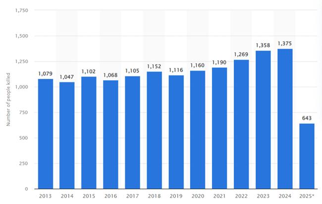 미국 내 경찰 총격으로 인한 사망자 수는 연간 1000명을 넘어선다. [통계=Statista]