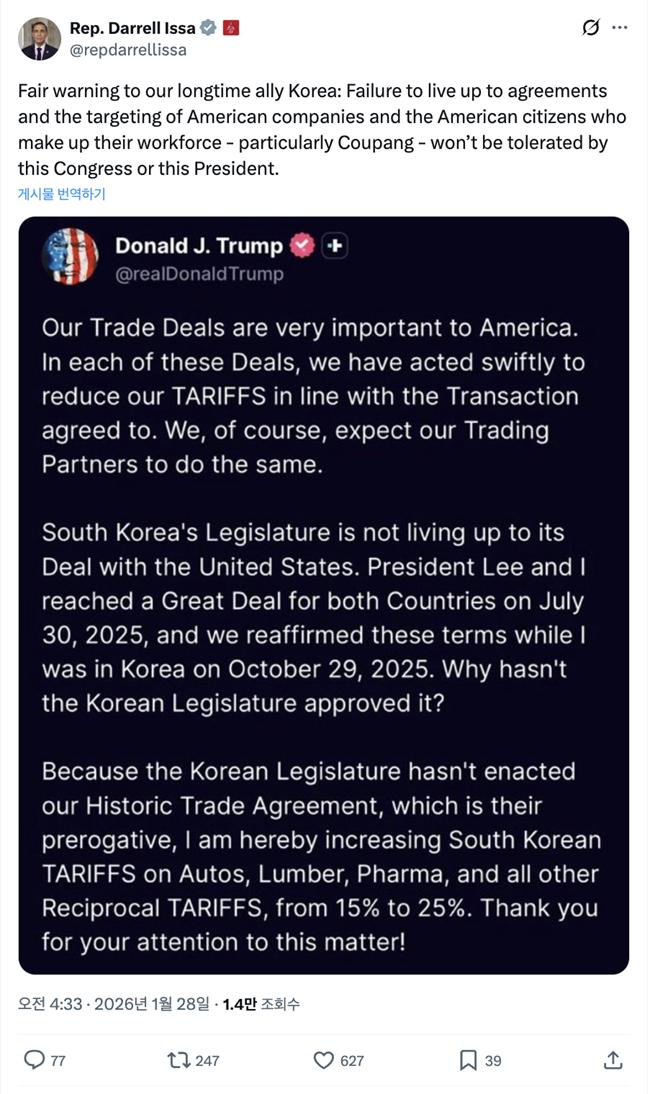 미연방의 하원 법사위원회 소속 ‘대릴 이사’ 공화당 의원도 소셜미디어 X에 트럼프의 SNS 발언을 캡처한 뒤 “쿠팡 같은 미국 기업들을 부당한 표적으로 삼으면 용납하지 않겠다”고 경고했다.