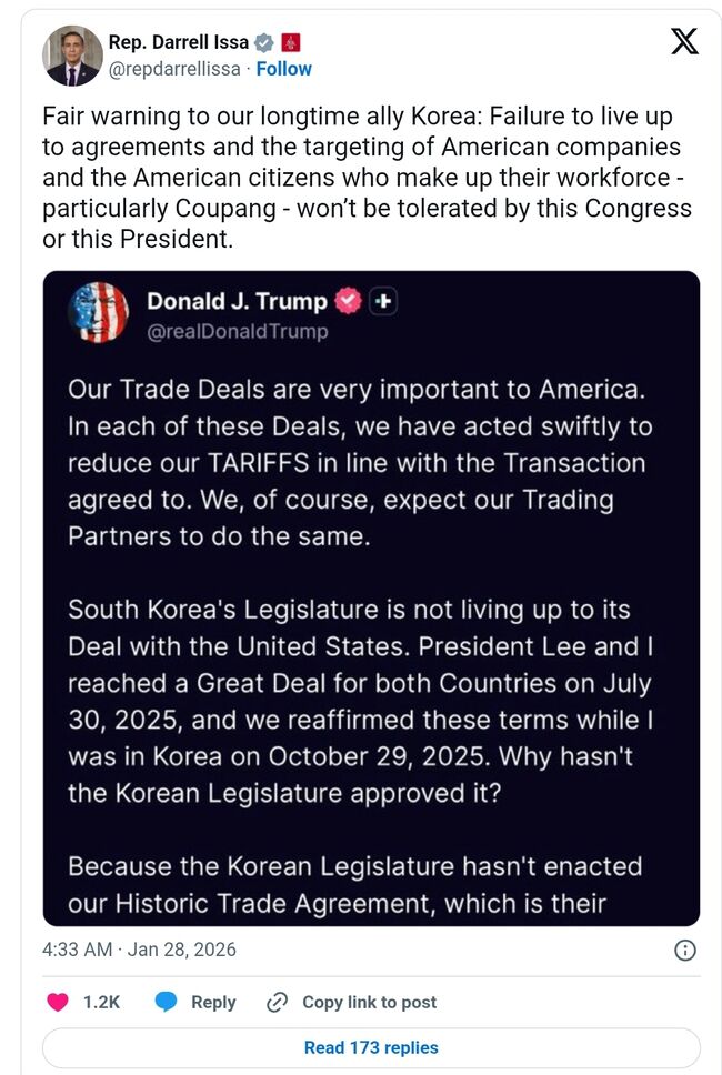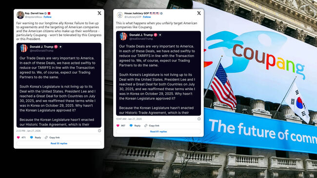 하원 법사위 공화당 엑스(X) 예정에도 "쿠팡과 같은 미국 기업을 부당하게 표적으로 삼으면 이런 일이 벌어진다"면서 트럼프 대통령의 관세 인상 발표문을 공유했다.