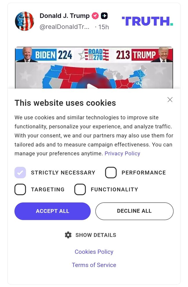 그는 트루스소셜에 "트럼프가 크게 이겼다. 부정선거였다!"라는 글과 함께 2020년 당시 NBC뉴스의 개표방송에 브래드 라펜스퍼거 조지아주 국무장관이 출연해 인터뷰한 영상을 게재했다.