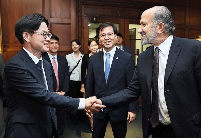 김정관 산업통상자원부 장관이 지난해 7월 24일(현지시간) 미국 워싱턴 DC 상무부 회의실에서 하워드 러트닉 상무부 장관과 악수하고 있다. 2025.7.25 [사진=연합뉴스]
