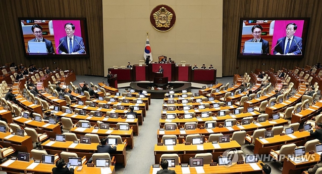 김민석 국무총리가 9일 정치·외교·통일·안보 분야 대정부질문이 열린 국회 본회의장에서 더불어민주당 윤후덕 의원의 질문에 답하고 있다. 2026.2.9 [사진=연합뉴스]