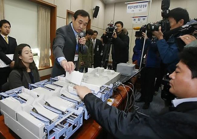 2012년 대선 때 자동개표기 오분류로 후보자 최종득표수에 일부 오류가 있다는 주장이 제기된 가운데, 서울 과천 중앙선거관리위원회 대회의실에서 선관위 직원들이 자동개표기 분류 등 개표과정 전반에 대해 설명하고 있다. 2013.11.13. [사진=연합뉴스]