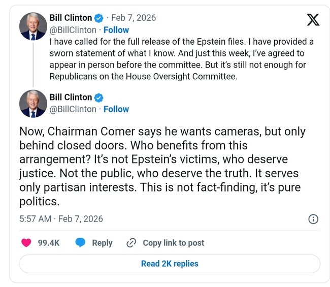 빌 클린턴 전 대통령과 힐러리 클린턴 전 국무장관이 다음 주 제프리 엡스틴 사건에 대한 하원 감독위원회 조사에 출석해 증언할 예정이다. 프랑스24는 이번 증언 녹취는 촬영되지만 비공개로 진해될 것이라고 보도했다.