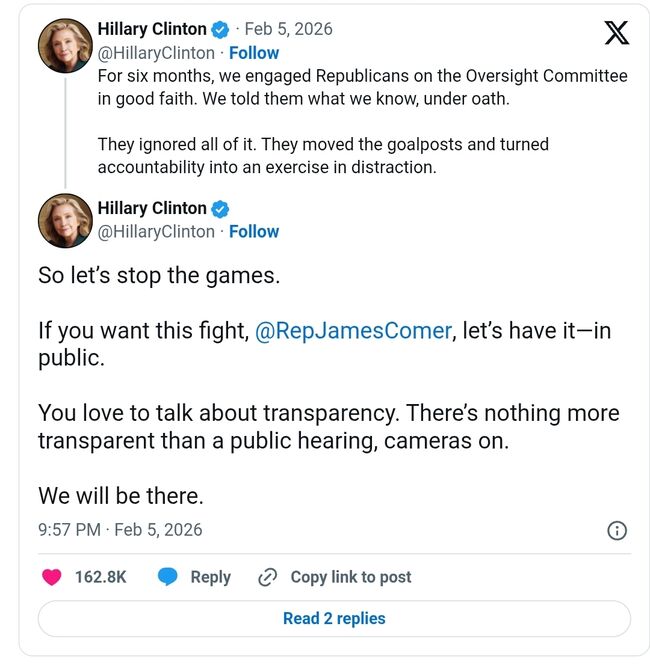 힐러리 클린턴은 이달초 엑스(X)에 "제임스 코머 의원님, 이 싸움을 원한다면 공개적으로 합시다. 당신은 투명성에 대해 자주 이야기하지만, 카메라가 켜진 공개 청문회보다 더 투명한 것은 없습니다."라며 "우리도 참석할 겁니다."라고 썼다.