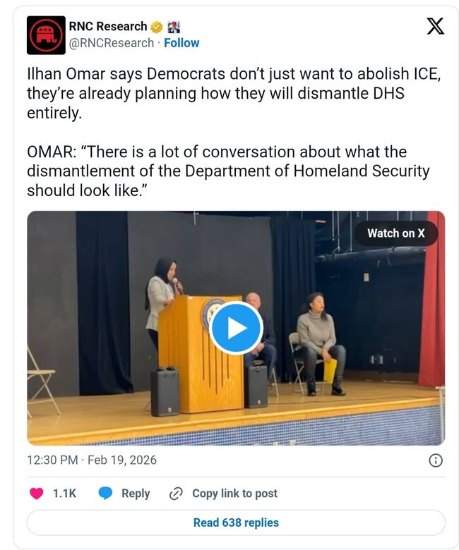 일한 오마르(Ilhan Omar,민주·미네소타) 미국 하원의원은 18일(현지시간) 타운홀 미팅에서 민주당이 이민세관집행국(ICE) 폐지하는 것뿐만 아니라 국토안보(DHS) 전체를 해체하는 방안을 계획하고 있다고 밝혔다.