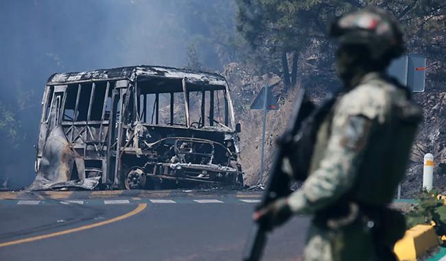 22일(현지시간) 멕시코 미초아칸 주 코인치오에서 할리스코 신세대 카르텔의 두목 엘 멘초 사망 후 불탄 차량 옆에서 군인이 경비를 서고 있다. [사진=AP]
