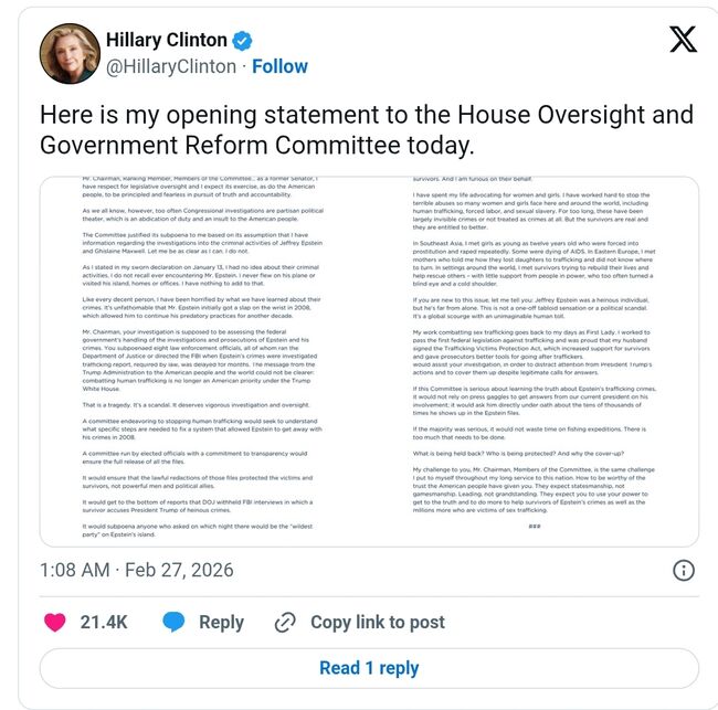 힐러리 클린턴은 엑스(X)에 공유한 모두발언에서 "나는 그들의 범죄 활동에 대해 전혀 알지 못했다. 엡스틴 씨를 만난 적이 없다고 생각한다."라고 말했다.