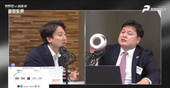박주현 변호가가 A-WEB 수사의 필요성을 역설하자 이준석 대표가 경청하고 있다. [팬앤마이크 영상 캡처]