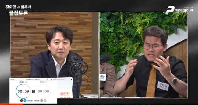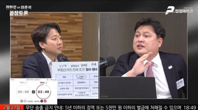 27일 오후 6시10분부터 유튜브채널 ‘팬앤마이크’를 통해 시작된 부정선거 끝장 토론회에서 전한길 대표와 이영돈 PD·박주현 변호사·김미영 VON 대표가 모습을 드러냈다.