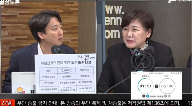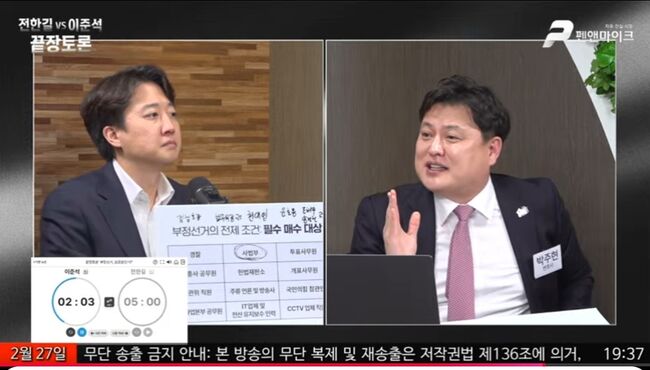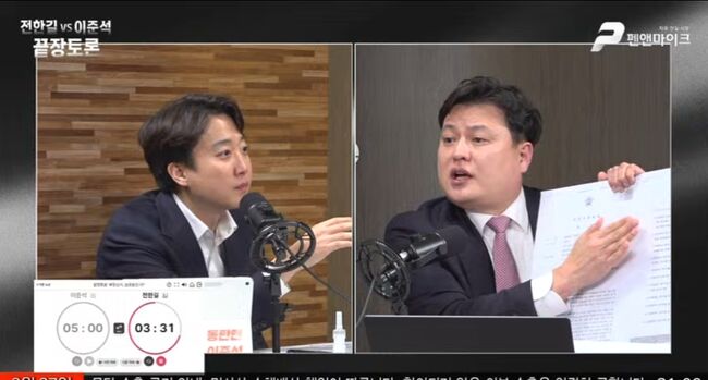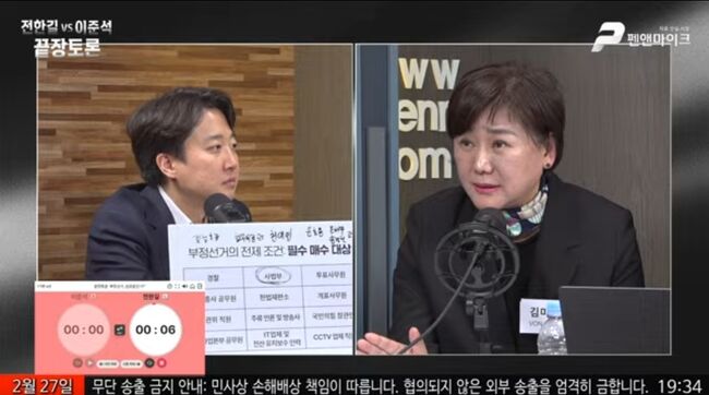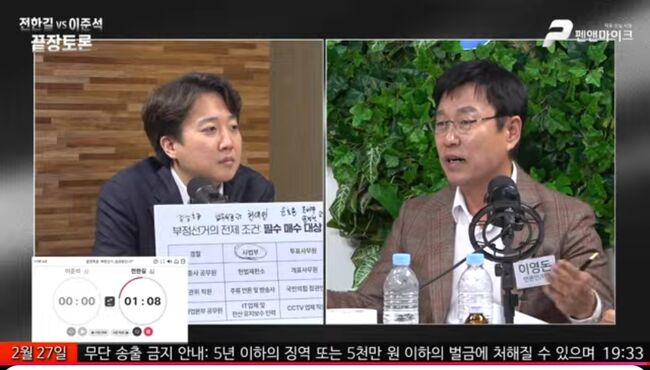 27일 오후 6시10분부터 유튜브채널 ‘팬앤마이크’를 통해 시작된 부정선거 끝장 토론회에서 전한길 대표와 이영돈 PD·박주현 변호사·김미영 VON 대표가 모습을 드러냈다.