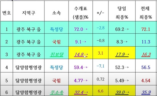 광주 동구갑의 수개표와 당일득표율 차이는 민주당(-0.3%p)·국힘당(+0.3%p), 완주·진안·무주는 민주당(-0.4%p)·국힘당(0.4%p)으로 대동소이했다.