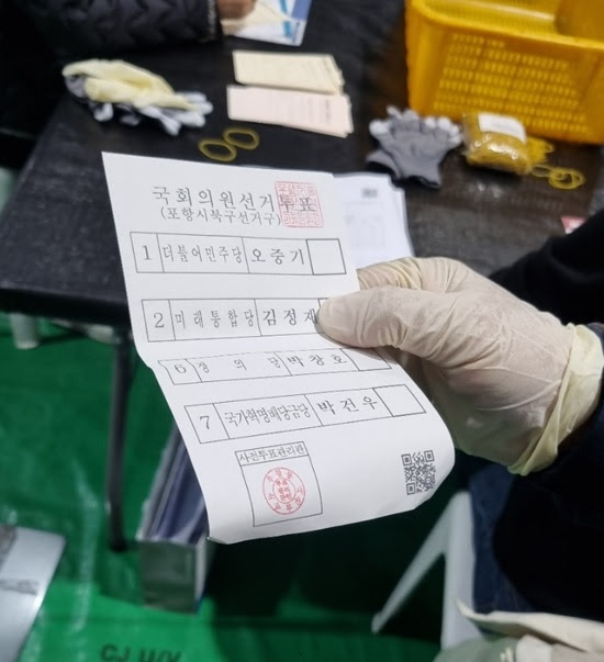 포항 북구에 마련된 제22대 총선 개표소의 심사·계수부에서 10일 QR코드가 있는 가짜 사전투표지가 발견됐다. 제보자 제공
