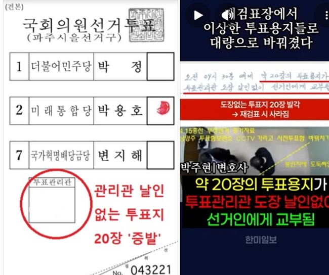 한미일보 유튜브 영상 ‘박주현 변호사 “재검표장 투표용지가 사라졌다”’ 편은 개표 시 문제가 되었던 ‘투표관리관 도장이 안 찍힌 투표지 20장’이, 재검표에선 감쪽같이 사라진 2020년 제21대 국회의원 선거에서 발생한 파주 금촌2동 부정선거 사건을 다루고 있다.