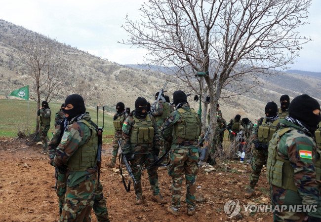 지난 2월 12일 이라크 아르빌 외곽의 한 기지에서 이란계 쿠르드족 정당인 쿠르드자유당(PAK) 소속 전사들이 훈련하는 모습 [로이터=연합뉴스]
