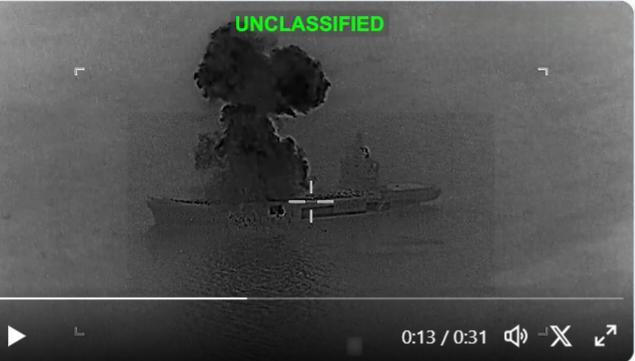 미군 중앙사령부가 6일 오전 10시(한국시간)에 올린, 이란 드론 운반기가 불타는 모습. [사진=소셜미디어 X]