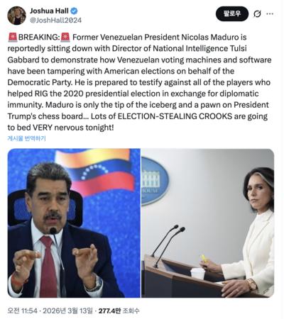 1.6 의회 사태로 누명을 쓰고 옥고를 치르다 트럼프 대통령 취임 첫날 행정명령으로 사면된 마가 지지자 조슈아 홀은 “마두로가 털시 개버드 미 국가정보국(DNI) 국장과 만나 베네수엘라의 투표 기계와 소프트웨어가 미국 민주당을 위해 미 대선을 조작해 온 방식을 설명할 예정”이라고 내다봤다.