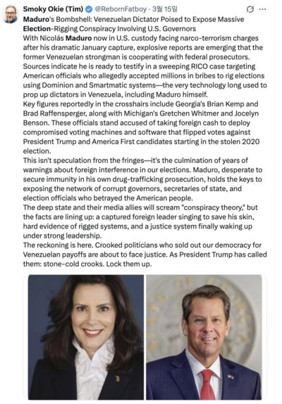 또 다른 마가 지지자 스모키 오키도 “연방 검찰 수사에 협력하는 마두로가 마이크 펜스(공화당) 전 부통령과 낸시 펠로시(민주당) 전 연방 하원의장을 2020년 미국 대선 부정과 연관시켰다”고 충격적인 소식을 전하며 “마두로는 연방 수사관들에게 펜스와 펠로시가 수백만 달러와 고급 승용차, 값비싼 보석 등을 수수했다고 진술한다”는 게시물을 15일 업로드했다.