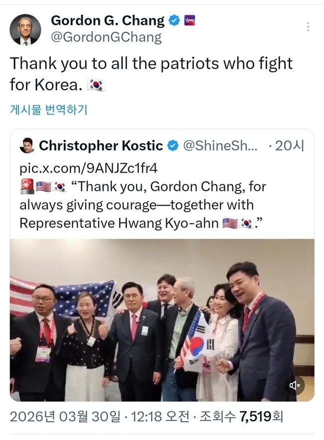 • 고든 창 “한국 위해 싸우는 애국자들께 감사”