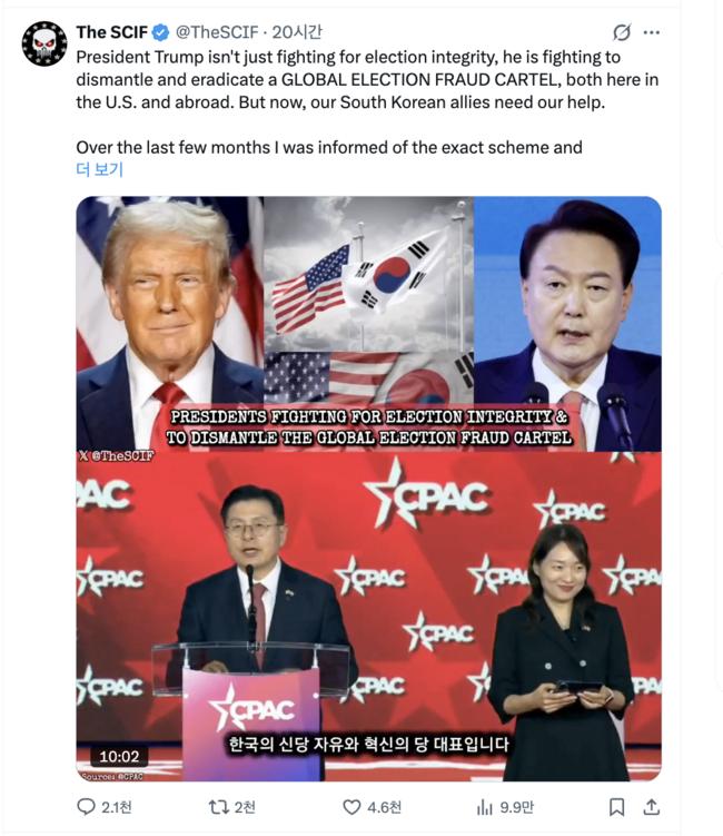 미국 부정선거 추적 전문 소셜미디어(SNS)도 황교안 대표의 활약에 높은 점수를 매겼다. 미 SCIF(@TheSCIF)는 29일(현지시간) X(엑스·옛 트위터) 계정을 통해 “지금 우리의 동맹국인 한국이 미국의 도움을 필요로 한다”고 알렸다.