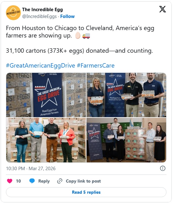 해당 웹사이트는 "지역 사회의 일원으로서, 계란 농부들은 봄철 여러 행사에서 중요한 역할을 하는 음식을 나누고 기여하는 것을 자랑스럽게 생각한다. 유월절 만찬과 계란 염색 전통부터 가족들이 함께 모이는 인기 레시피까지, 계란은 다양한 문화 행사에 활용된다."라고 설명하고, "올해 '위대한 미국 계란 기증 운동(Great American Egg Drive)'는 농장과 푸드뱅크를 연결하여 도움이 필요한 지역 사회에 신선한 단백질을 제공하는 비영리 단체인 HATCH와의 파트너십을 통해 확대됐다."라고 덧붙였다.