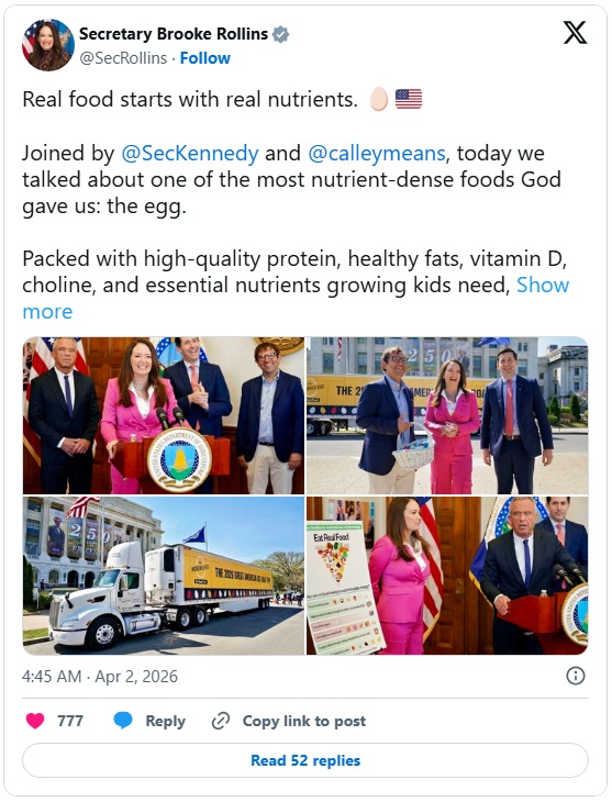 그녀는 "고품질 단백질, 건강한 지방, 비타민 D, 콜린, 그리고 성장기 어린이에게 필요한 필수 영양소가 풍부한 달걀은 우리가 식탁, 학교, 그리고 건강에 대한 국가적 논의의 중심에 다시 놓아야 할 바로 그런 진정한 음식"이라고 말했다.