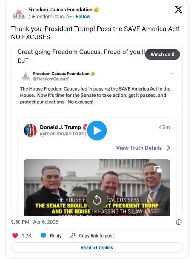 영상에서 프리덤코커스는 "상원은 언제든 세이브 아메리카 법안을 원내 표결에 붙일 수 있다"고 주장했다.