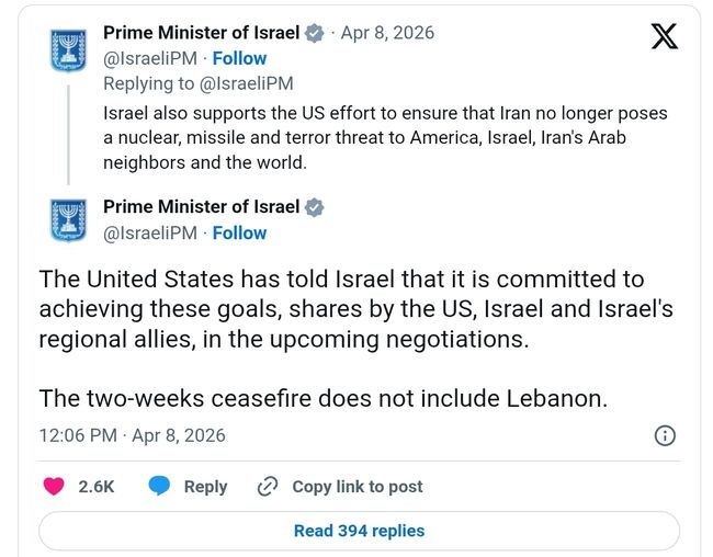 그러나 성명은 "2주간의 휴전은 레바논을 포함하지 않는다"고 강조하며, 앞서 중재국인 파키스탄이 휴전이 레바논 전선에도 적용될 것이라고 시사했던 발언과 정면으로 배치되는 입장을 보였다.