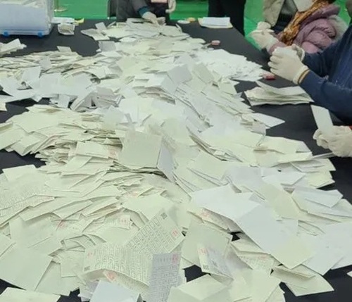 제20대 대통령 선거가 있었던 2022년 3월9일 오후 9시경 남동구의 한 개표소에서 관내 사전선거 투표지 중 누런색 투표용지가 무더기로 발견돼 참관인 A씨가 이의를 제기했다. [시진=경향신문]