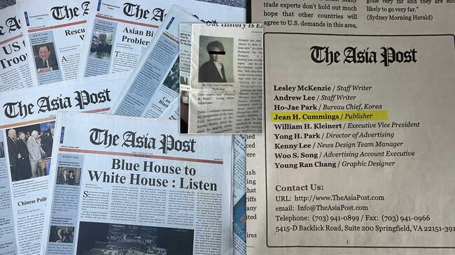 2003~2006년 발행된 'The Asia Post". 오른쪽은 명단에 진 커밍스가 발행인으로 표시돼 있다. 사진속 눈부분은 본인 요청에 따라 가림 처리했다. [사진=진 커밍스 본인 제공]