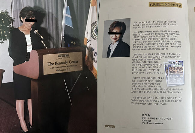 2001년 7월, 솔리스트앙상블의 케네디센터 공연을 주최했을 당시 진 커밍스(박진현) 발행인 모습(왼쪽)과 프로그램에 실린 인사말(오른쪽). [사진=진 커밍스 본인 제공]