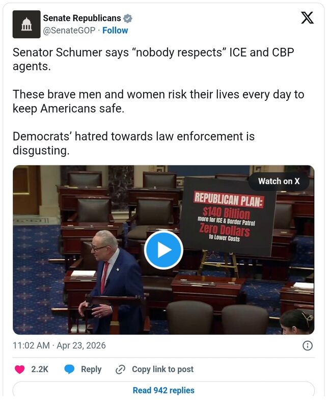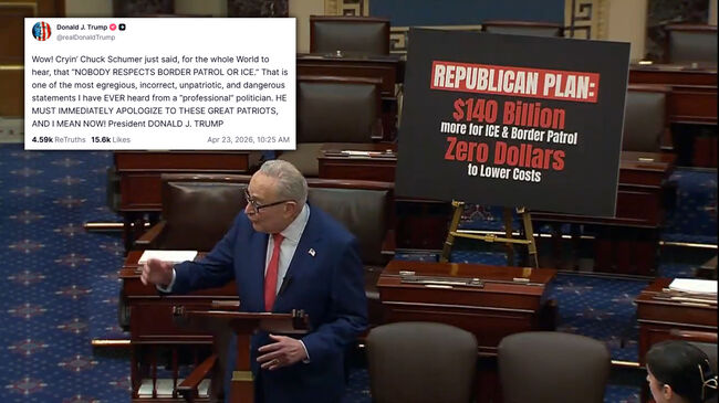 그는 23일(목) 트루스소셜에 "와! 징징대는 척 슈머가 전 세계가 듣는 앞에서 '아무도 국경순찰대나 ICE를 존중하지 않는다'고 말했다"라며 "이건 내가 '전문' 정치인에게서 들어본 가장 터무니없고, 부정확하고, 비애국적이고, 위험한 발언 중 하나다. 그는 당장 이 위대한 애국자들에게 사과해야 한다, 지금 당장!"이라고 썼다.